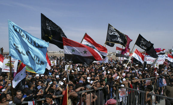 Iraqi Sunni Muslims take part in an anti-government demonstration in Falluja, 50 km (31 miles) west of Baghdad March 1, 2013. Iraq’s finance minister told crowds of Sunni Muslim protesters on Friday he was resigning, after more than two months of demonstrations demanding an end to marginalisation of their minority sect. REUTERS/Mohanned Faisal (IRAQ – Tags: POLITICS CIVIL UNREST) – RTR3EFVK