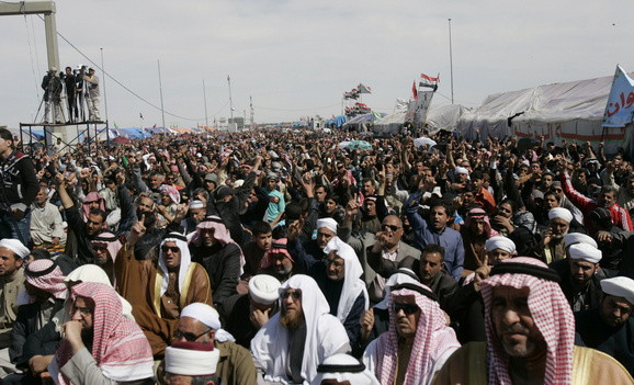 Sunni Muslims chant “Allahu Akbar”, meaning God is great, during an anti-government demonstration in Ramadi, 100 km (62 miles) west of Baghdad, March 8, 2013.Thousands of Sunni Muslims protested after Friday prayers in huge rallies against Shi’ite Iraqi Prime Minister Nuri al-Maliki, demanding that he step down. REUTERS/Ali al-Mashhadani (IRAQ – Tags: CIVIL UNREST POLITICS RELIGION) – RTR3EQ8A
