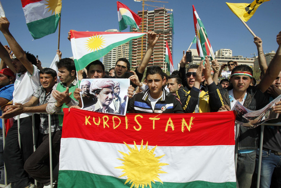 Men hold Kurdish flags and a poster of Kurdistan leader Masoud Barazani during a Nowruz celebration organized by Kurdish groups at the seaside town of Rawshe in Beirut, March 21, 2013. REUTERS/Sharif Karim (LEBANON – Tags: RELIGION POLITICS) – RTR3FA2H