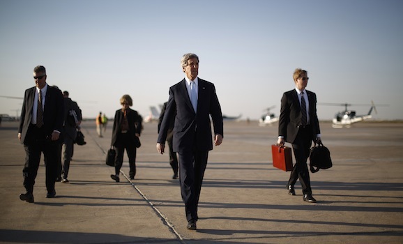 U.S. Secretary of State John Kerry (2nd R) walks across the tarmac of Baghdad International Airport as he prepares to board an aircraft out of the Iraqi capital March 24, 2013. Kerry made an unannounced visit to Iraq on Sunday and said he told Prime Minister Nuri al-Maliki of his concern about Iranian flights over Iraq carrying arms to Syria. REUTERS/Jason Reed (IRAQ – Tags: POLITICS) – RTXXVZZ
